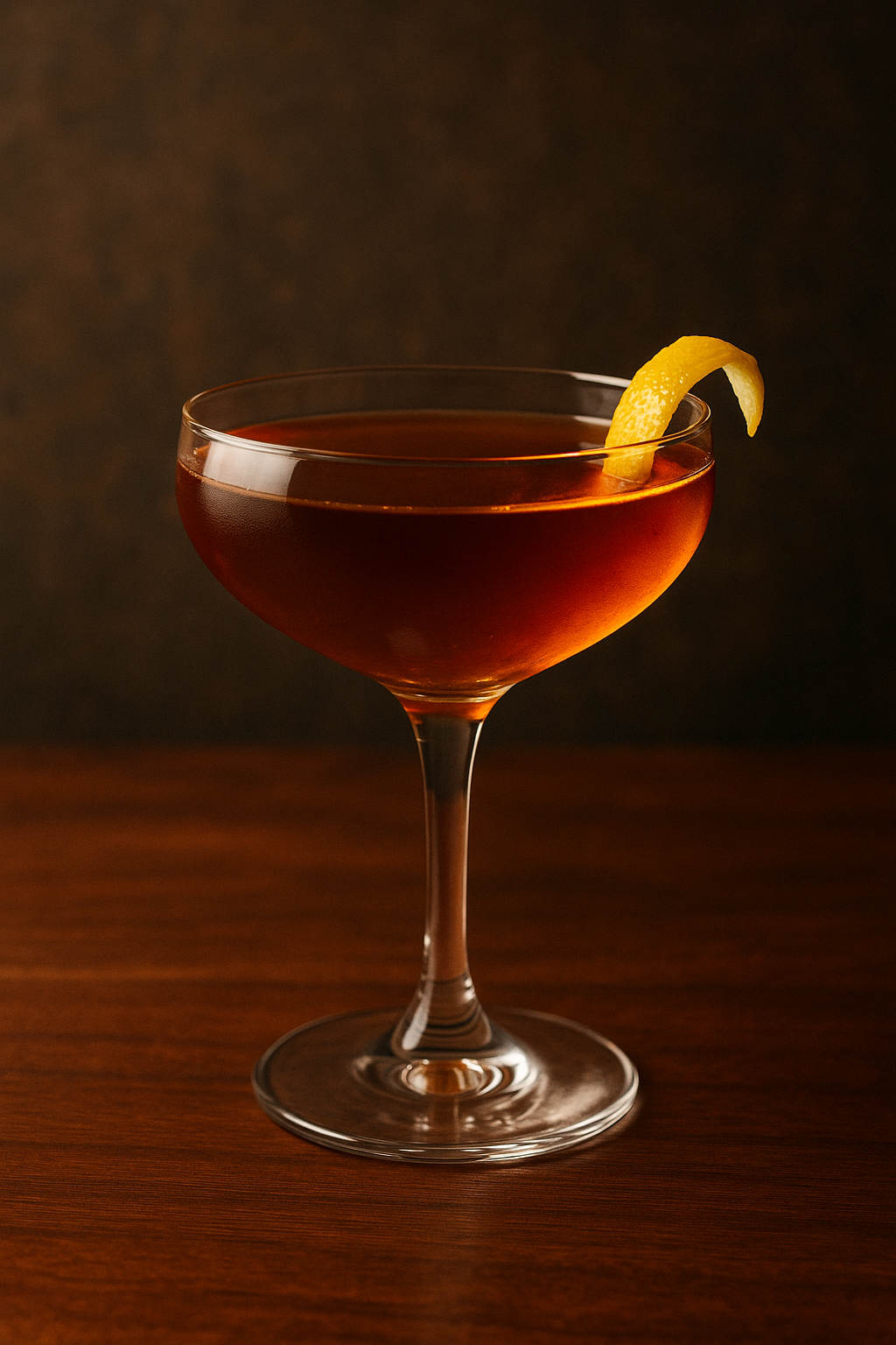 Express an orange peel over the glass and garnish with the peel